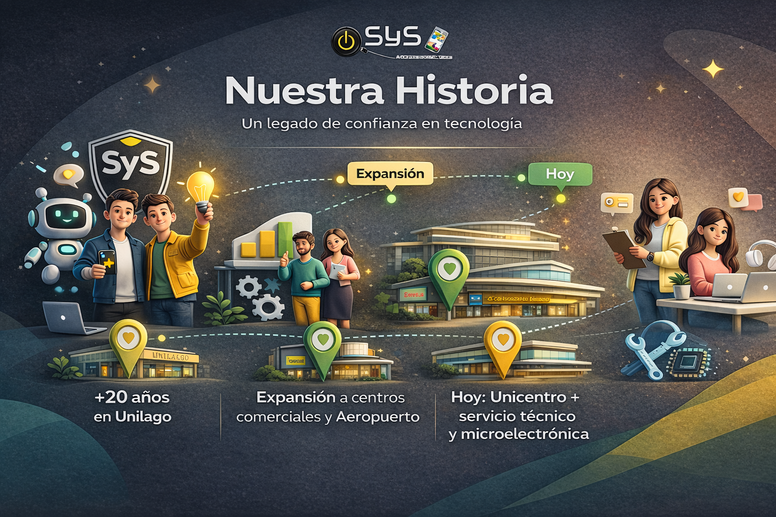 SyS Accessories es más que una tienda de tecnología; es una historia construida a partir de un sueño.Nació del propósito de dos jóvenes emprendedores que decidieron crear un legado para las personas más importantes de sus vidas: Sofía y Sara. Apasionados por la tecnología, asumieron el reto de compartir su conocimiento y experiencia con la comunidad bogotana, convirtiendo ese sueño en una empresa sólida y en constante crecimiento.Hace más de 20 años iniciamos este camino en Unilago, el Centro de Alta Tecnología, consolidándonos como especialistas en el sector. Con el tiempo, expandimos nuestra presencia a importantes centros comerciales como CC Bulevar Niza, CC Titán Plaza, CC Gran Plaza Ensueño, Gran Plaza Soacha y CC Fontanar, donde desarrollamos alianzas estratégicas con los almacenes Éxito y Carulla.También llevamos nuestra experiencia al Aeropuerto El Dorado, uno de los escenarios comerciales más importantes del país. Más recientemente, llegamos a Unicentro, donde consolidamos una nueva etapa que refleja la evolución, el aprendizaje y el crecimiento que hemos construido a lo largo de los años.Hoy, con orgullo, los dos grandes motivos que dieron origen a este sueño hacen parte activa del proyecto, aportando nuevas ideas y fortaleciendo la visión de futuro. Verlas crecer junto a la empresa es la mayor satisfacción, porque este legado fue creado por ellas y para ellas.Nuestro compromiso ha sido siempre el mismo: ofrecer productos de calidad, un servicio cercano y amable, y garantizar la mejor experiencia a cada cliente que visita nuestras tiendas.Además de contar con un amplio portafolio de accesorios tecnológicos, ofrecemos servicio técnico especializado y microelectrónica para todo tipo de dispositivos electrónicos, brindando un respaldo real basado en la honestidad, la transparencia y la experiencia.Creemos que la tecnología debe ser accesible, confiable y respaldada por profesionales que realmente entienden lo que venden. Por eso, cada producto que adquieres en SyS representa una inversión segura y bien asesorada.SyS Accessories: un legado de confianza para tu hogar.